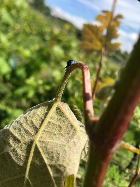 Der Rebstichler ist zwar ein Schädling, aber auch ein sehr hübscher, schillernder Käfer mit Rüssel. Er bohrt den Blattstiel an und rollt das Blatt zu einer 'Zigarre'. Darin sind dann die Eier geschützt. Wir lassen die 'Zigarren' hängen.