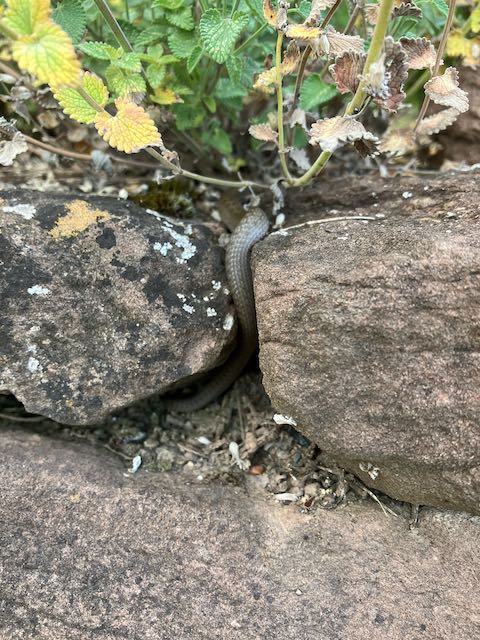 Eine Trockenmauer ist erfolgreich renoviert, wenn sie auch interessant ist für neue 'Mieter'. In diesem Fall eine harmlose aber geschützte Schlingnatter mit ihren Flecken als Zeichnung