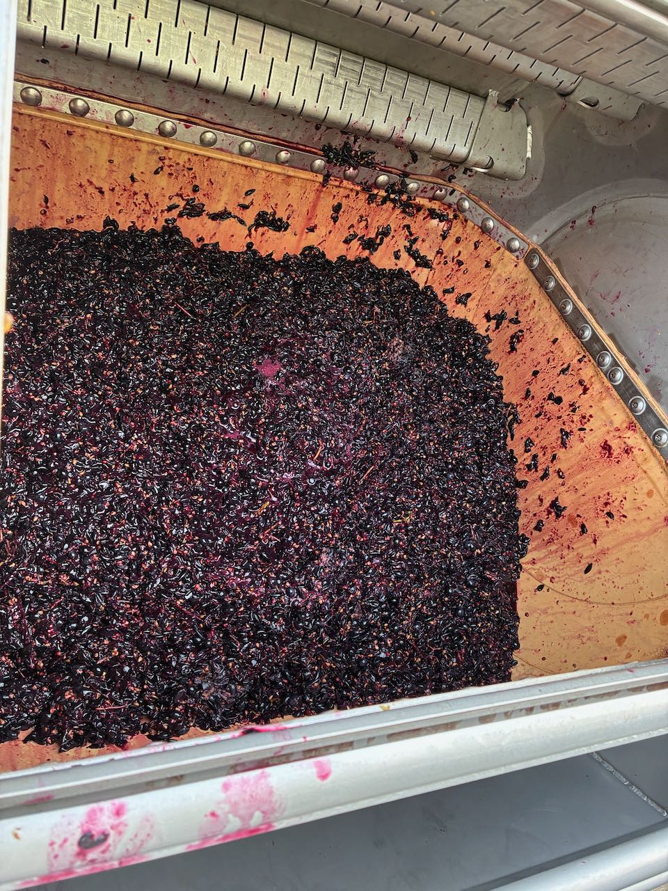 - Maischen der Trauben - Saft und Beeren kommen in ein großes Maischefaß